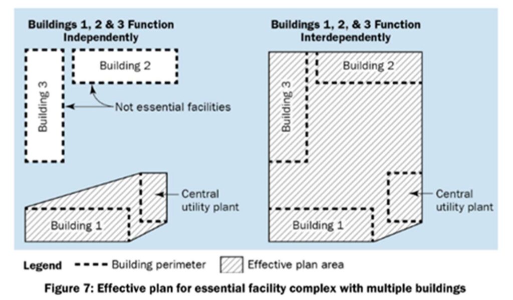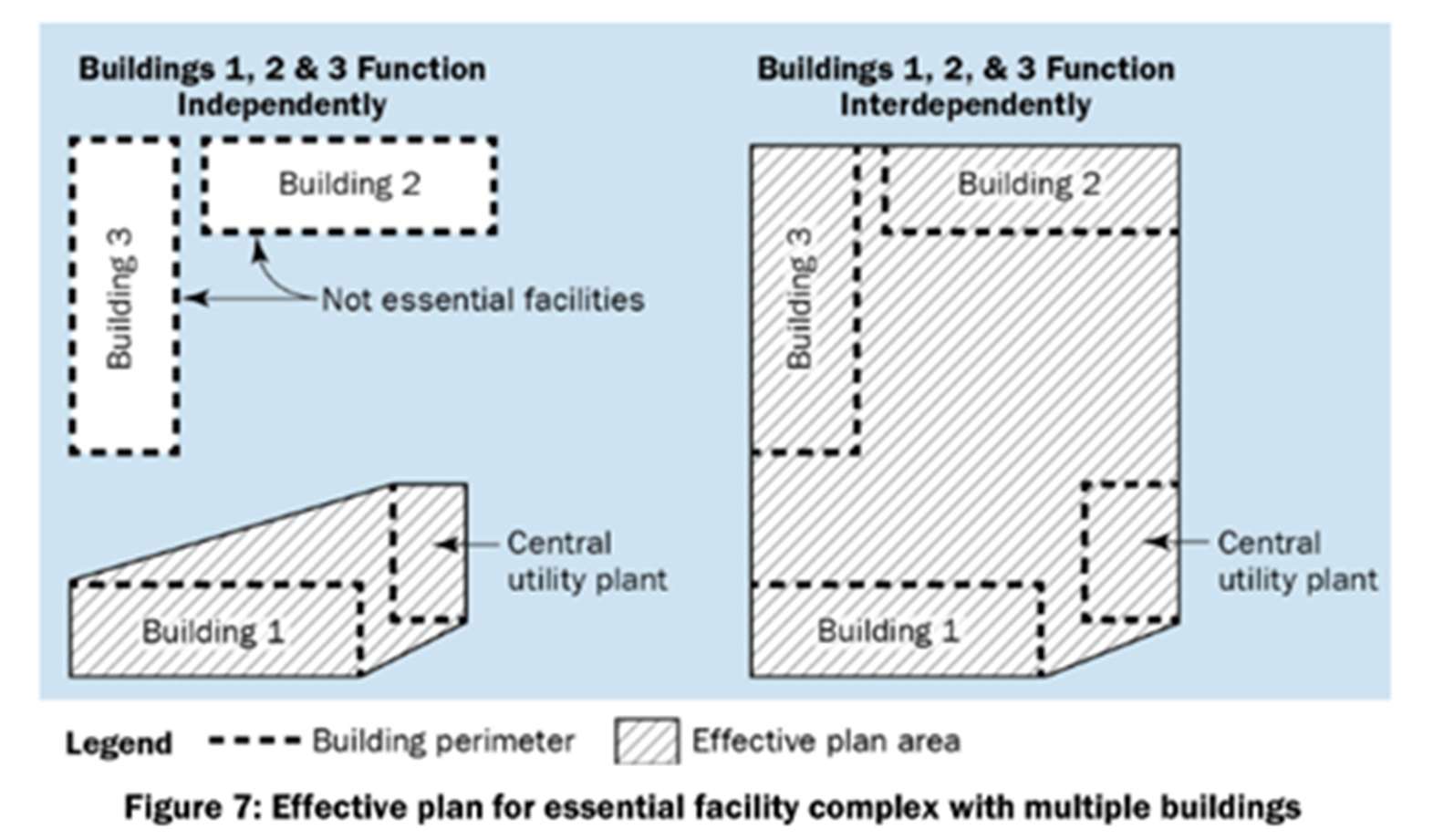 For Essential Facilities, the effective plan area includes the smallest convex polygon enclosing both the essential facility (or facilities) and all the buildings and structures required to maintain the functionality of the essential facility or facilities. Examples below are from FEMA/NIST’s ‘Design Guide for New Tornado Load Requirements in ASCE 7-22’.