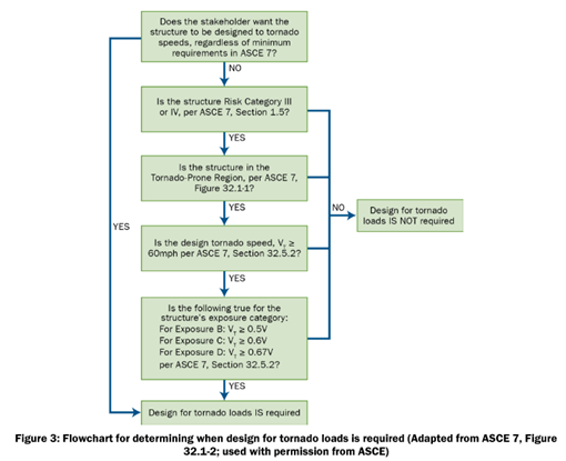 Tornado Loads: Consideration of tornado loading has been included in this code cycle. A flowchart has been developed to aid in determining if a building or structure is required to be designed for tornado loading. Below is a version of the flowchart from FEMA/NIST’s ‘Design Guide for New Tornado Load Requirements in ASCE 7-22’. If the end user desires the structure to be designed for tornado loading then those requirements are to be considered. If the building or structure is classified as Risk Category III or IV, tornado loads are to be investigated further.